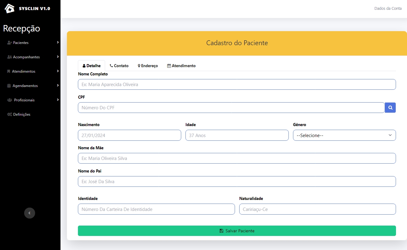 Cadastro completo de pacientes, com informações detalhadas e histórico clínico integrado.